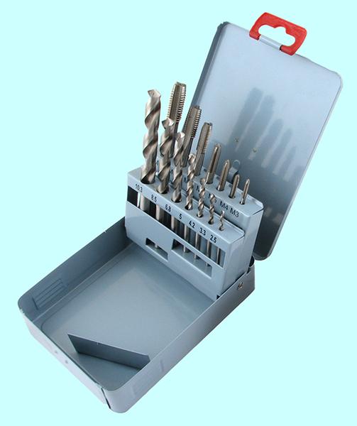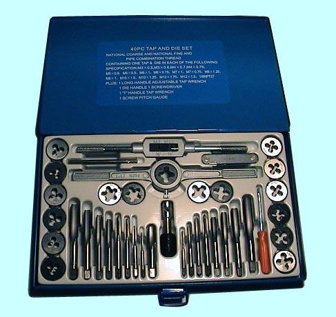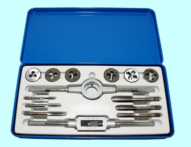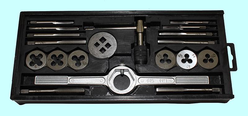 Комплектация набора: метчики однопроходные UNC: 1/4"-20ниток/дюйм, 5/16"-18ниток/дюйм, 3/8"-16ниток/дюйм, 7/16"-14ниток/дюйм, 1/2"-13ниток/дюйм; плашки круглые UNC: 1/4"-20ниток/дюйм, 5/16"-18ниток/дюйм, 3/8"-16ниток/дюйм, 7/16"-14ниток/дюйм, 1/2"-13ниток/дюйм; вороток для метчиков М3-М12 (1/16"-1/2"); плашкодержатель М25 (1")