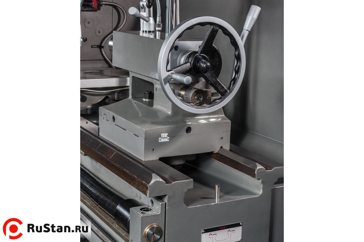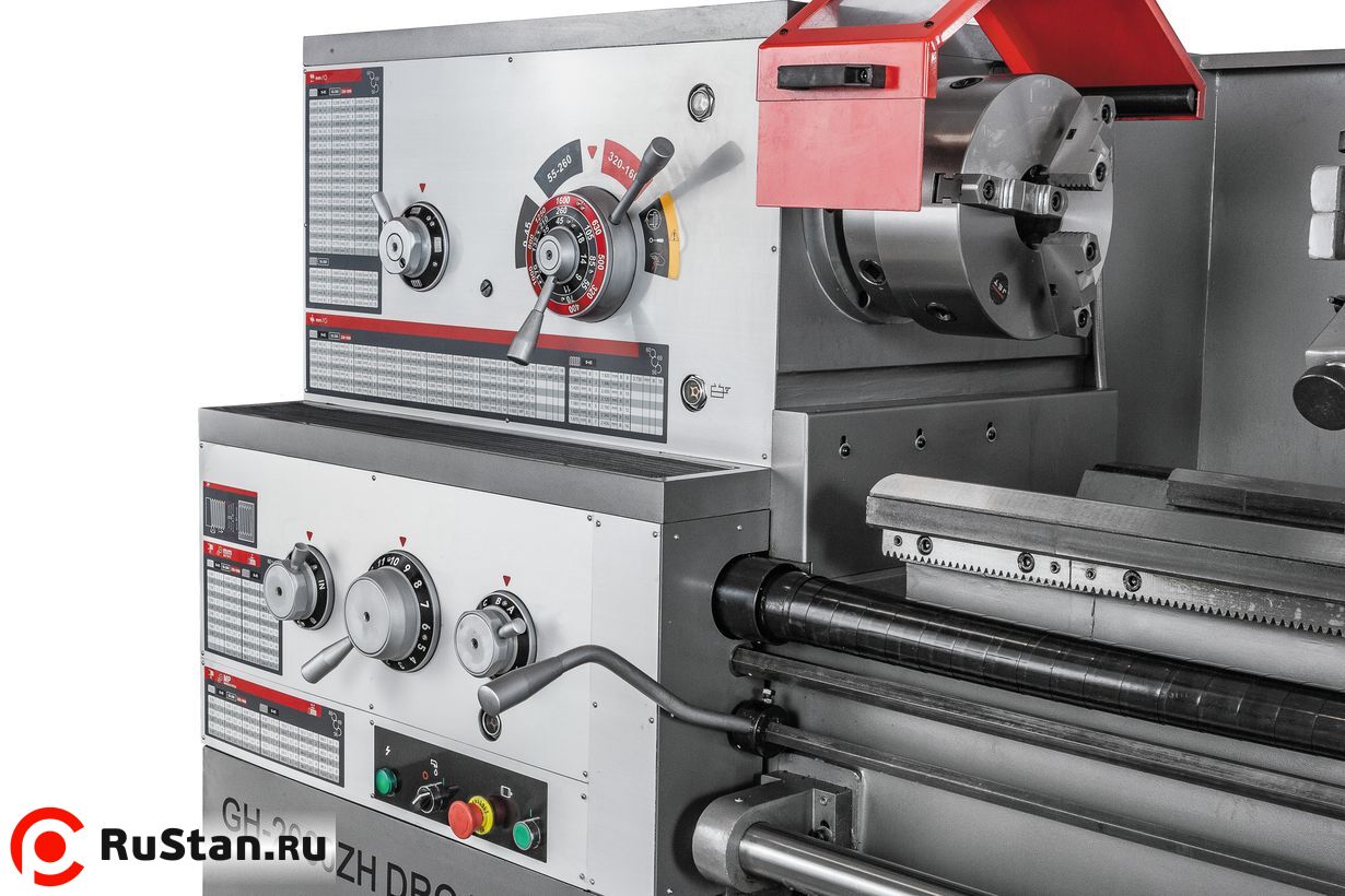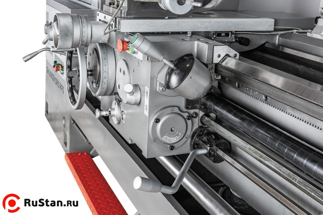 Передняя бабка станка комплектуется электромеханической муфтой, механизм плавного пуска защищает двигатель от пиковых стартовых нагрузок. Привод шпинделя данной модели постоянно находится в масляной ванне, что позволяет решить проблему его смазки, охлаждения и снизить уровень шума. Такой же подход применен и к шестерням передней бабки и коробки подач. На станке можно обрабатывать заготовки на скоростях от 9 до 1600 об/мин, режим 9 об/мин используется для нарезания резьбы плашкой. GH-2060ZH DRO RFS оснащен удобным управлением продольной и поперечной подачей посредством джойстика, предусмотрена возможность ускоренного перемещения суппорта. Для облегчения смены режимов работы предусмотрен толчковый (импульсный) пуск двигателя. Коробка подач станка имеет 80 предустановленных режимов, что позволяет с точностью нарезать метрические, дюймовые, питчевые и модульные резьбы, при этом биение на шпинделе не превышает 9 микрон.